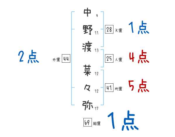 総運![]() | 中野渡菜々弥さんの総運は69画の1つ星!不満を感じやすい傾向が。ストレスを貯めないように注意しましょう。 あなたの人生を表す1番重要な運勢です。生涯を通じて影響する総合運となり、主に50歳以降の晩年期に影響を及ぼします。 |