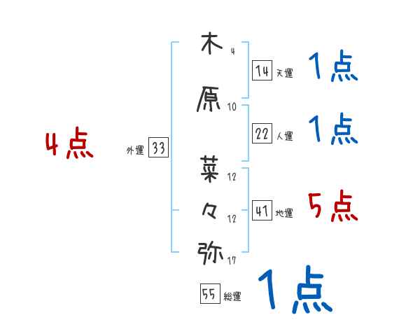 外運![]() | 木原菜々弥さんの外運は33画の4つ星!権力志向でプライドが高い。勇気があり運を切り開き成功する。 生活面を象徴する運勢です。外部から受ける影響力を表し、結婚運、家庭運や職場、環境への順応性を表します。 |