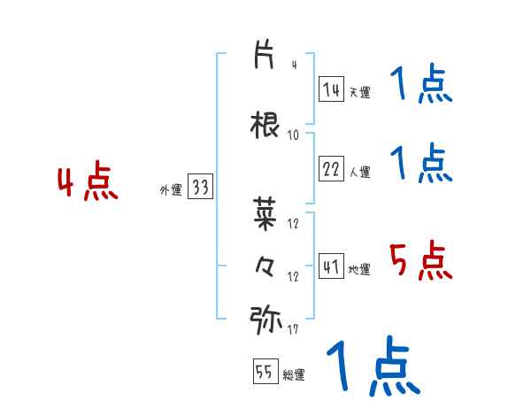 外運![]() | 片根菜々弥さんの外運は33画の4つ星!権力志向でプライドが高い。勇気があり運を切り開き成功する。 生活面を象徴する運勢です。外部から受ける影響力を表し、結婚運、家庭運や職場、環境への順応性を表します。 |