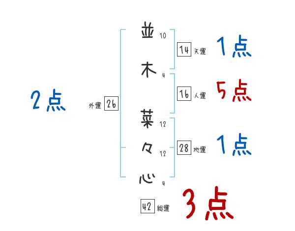 外運![]() | 並木菜々心さんの外運は26画の2つ星!波瀾万丈かも。信頼できる人を大事にしましょう。 生活面を象徴する運勢です。外部から受ける影響力を表し、結婚運、家庭運や職場、環境への順応性を表します。 |