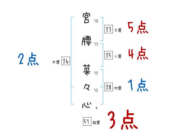 天運![]() | 宮腰菜々心さんの天運は23画の5つ星!想像力に優れ活力がある。一代で成功し名誉を手に入れる。 家系が持つ宿命的な運勢を表します。祖先から受け継いだ苗字ですので自分の力が及びません。家柄を象徴します。 |