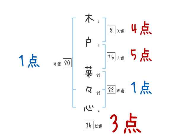 総運![]() | 木戸菜々心さんの総運は36画の3つ星!先見性が豊かです。多少神経質で苦労することも。 あなたの人生を表す1番重要な運勢です。生涯を通じて影響する総合運となり、主に50歳以降の晩年期に影響を及ぼします。 |