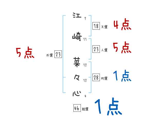 総運![]() | 江崎菜々心さんの総運は46画の1つ星!迷走することが多く苦労するかも。目先のことにとらわれないように。 あなたの人生を表す1番重要な運勢です。生涯を通じて影響する総合運となり、主に50歳以降の晩年期に影響を及ぼします。 |
