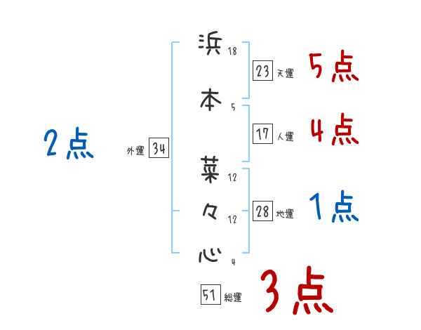 外運![]() | 浜本菜々心さんの外運は34画の2つ星!独創性に優れるが、自尊心が強く災難に注意しましょう。 生活面を象徴する運勢です。外部から受ける影響力を表し、結婚運、家庭運や職場、環境への順応性を表します。 |