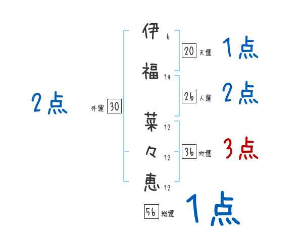総運![]() | 伊福菜々恵さんの総運は56画の1つ星!消極的で無気力になりがち。誠実な気持ちが必要でしょう。 あなたの人生を表す1番重要な運勢です。生涯を通じて影響する総合運となり、主に50歳以降の晩年期に影響を及ぼします。 |