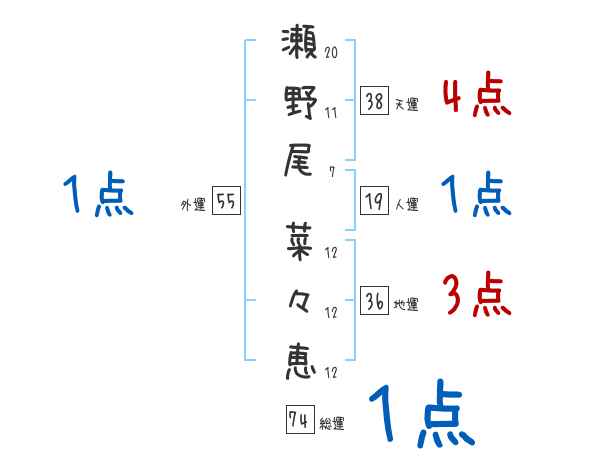 総運![]() | 瀬野尾菜々恵さんの総運は74画の1つ星!無気力で怠惰な生活送りがち。規則正しい生活を送るよう気をつけましょう。 あなたの人生を表す1番重要な運勢です。生涯を通じて影響する総合運となり、主に50歳以降の晩年期に影響を及ぼします。 |
