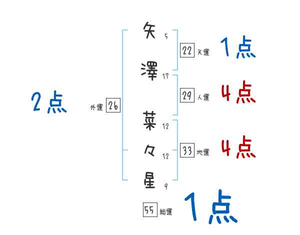 天運![]() | 矢澤菜々星さんの天運は22画の1つ星!努力することが苦手ないっぽう手先が器用。芸術性にも優れる。 家系が持つ宿命的な運勢を表します。祖先から受け継いだ苗字ですので自分の力が及びません。家柄を象徴します。 |