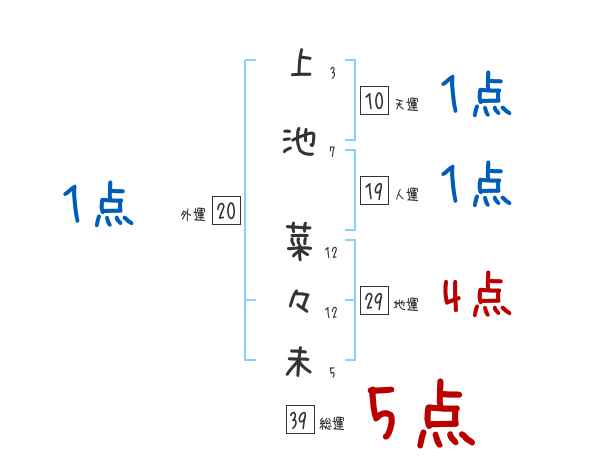 天運![]() | 上池菜々未さんの天運は10画の1つ星!不安を感じやすい傾向。ストレスを抱えないように注意しましょう。 家系が持つ宿命的な運勢を表します。祖先から受け継いだ苗字ですので自分の力が及びません。家柄を象徴します。 |
