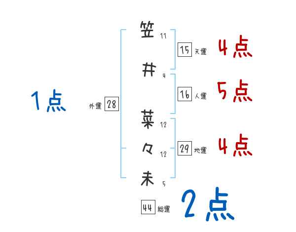総運![]() | 笠井菜々未さんの総運は44画の2つ星!誠実で慎重な性格。物事を考えすぎないように注意しましょう。 あなたの人生を表す1番重要な運勢です。生涯を通じて影響する総合運となり、主に50歳以降の晩年期に影響を及ぼします。 |