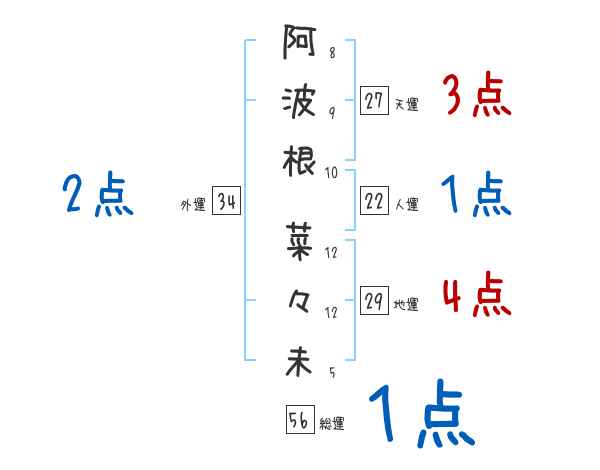 天運![]() | 阿波根菜々未さんの天運は27画の3つ星!頭脳明晰だが強情で摩擦が多い傾向。孤立に注意。 家系が持つ宿命的な運勢を表します。祖先から受け継いだ苗字ですので自分の力が及びません。家柄を象徴します。 |