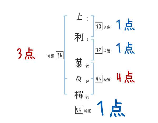 | 天運  | 上利菜々桜さんの天運は10画の1つ星!不安を感じやすい傾向。ストレスを抱えないように注意しましょう。家系が持つ宿命的な運勢を表します。祖先から受け継いだ苗字ですので自分の力が及びません。家柄を象徴します。 |