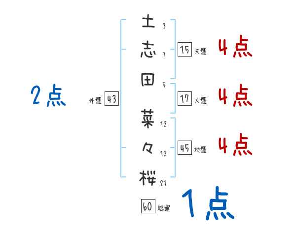 地運![]() | 土志田菜々桜さんの地運は45画の4つ星!もくもくと物事を進め達成する。地味な努力家。 個性を表す基礎的な運勢です。性格形成や対人関係、行動力など家庭環境に影響されます。主に誕生してから20歳くらいまでの若年期の運勢を表します。 |