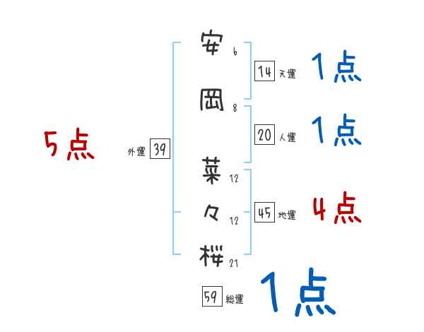 外運![]() | 安岡菜々桜さんの外運は39画の5つ星!社交性に優れ人望が厚い。人の上に立ち成功する。 生活面を象徴する運勢です。外部から受ける影響力を表し、結婚運、家庭運や職場、環境への順応性を表します。 |