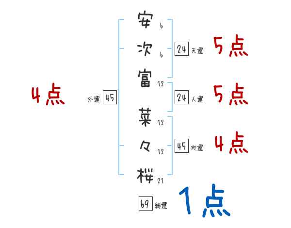 人運![]() | 安次富菜々桜さんの人運は24画の5つ星!家庭運が良く順調な人生。金運にも恵まれる。 性格や才能などを表す2番目に重要な運勢です。人間関係や協調性、社会的な成功に影響します。主に20歳から50歳ぐらいまでの中年期の運勢を表します。 |