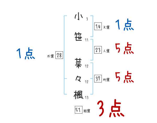 天運![]() | 小笹菜々楓さんの天運は14画の1つ星!人に対して優しいがストレスを溜め込みがち。人間関係のトラブルを避けるよう気をつけましょう。 家系が持つ宿命的な運勢を表します。祖先から受け継いだ苗字ですので自分の力が及びません。家柄を象徴します。 |