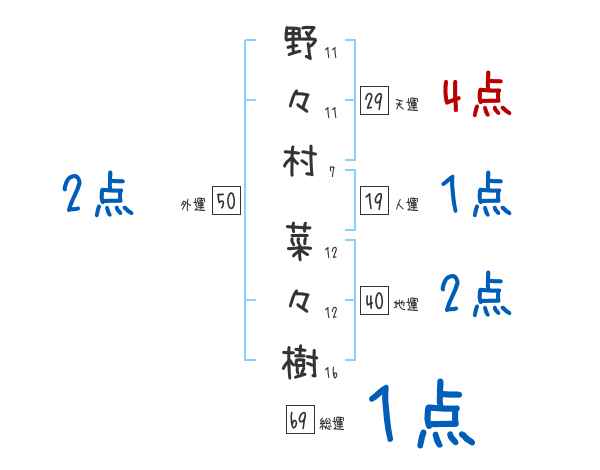 外運![]() | 野々村菜々樹さんの外運は50画の2つ星!浮き沈みが激しく不安定。しりすぼみに衰退しやすいので注意しましょう。 生活面を象徴する運勢です。外部から受ける影響力を表し、結婚運、家庭運や職場、環境への順応性を表します。 |