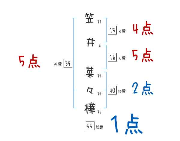 外運![]() | 笠井菜々樺さんの外運は39画の5つ星!社交性に優れ人望が厚い。人の上に立ち成功する。 生活面を象徴する運勢です。外部から受ける影響力を表し、結婚運、家庭運や職場、環境への順応性を表します。 |