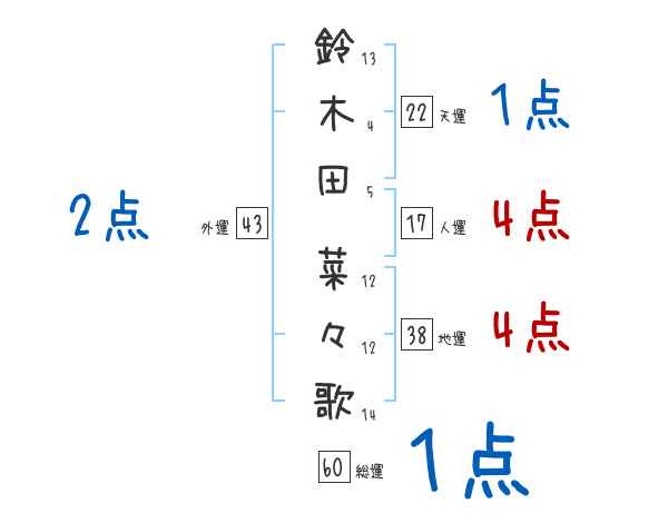 総運![]() | 鈴木田菜々歌さんの総運は60画の1つ星!悲観的で迷いやすい。波乱が多く損をしないように。 あなたの人生を表す1番重要な運勢です。生涯を通じて影響する総合運となり、主に50歳以降の晩年期に影響を及ぼします。 |