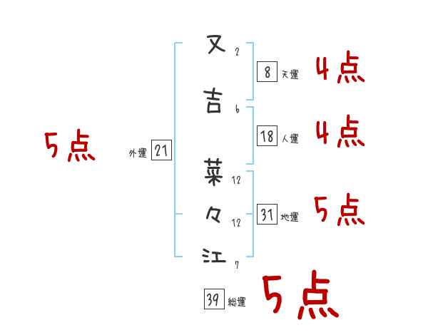 総運![]() | 又吉菜々江さんの総運は39画の5つ星!社交性に優れ人望が厚い。人の上に立ち成功する。 あなたの人生を表す1番重要な運勢です。生涯を通じて影響する総合運となり、主に50歳以降の晩年期に影響を及ぼします。 |