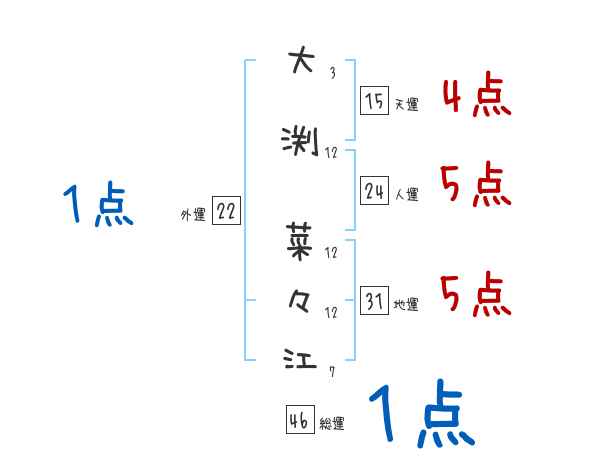 総運![]() | 大渕菜々江さんの総運は46画の1つ星!迷走することが多く苦労するかも。目先のことにとらわれないように。 あなたの人生を表す1番重要な運勢です。生涯を通じて影響する総合運となり、主に50歳以降の晩年期に影響を及ぼします。 |