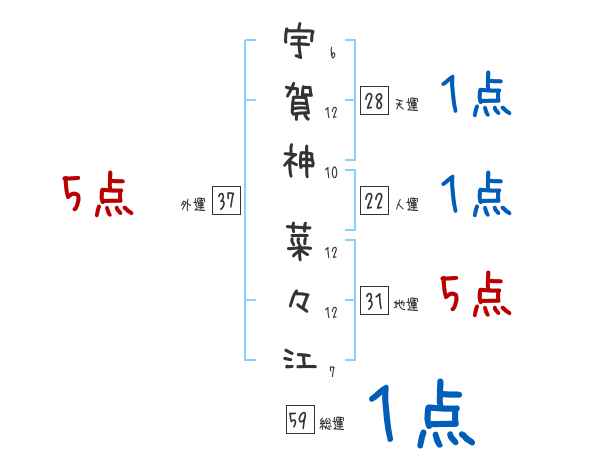 天運![]() | 宇賀神菜々江さんの天運は28画の1つ星!家庭環境に注意。スポーツで活躍できる能力があるかも。 家系が持つ宿命的な運勢を表します。祖先から受け継いだ苗字ですので自分の力が及びません。家柄を象徴します。 |
