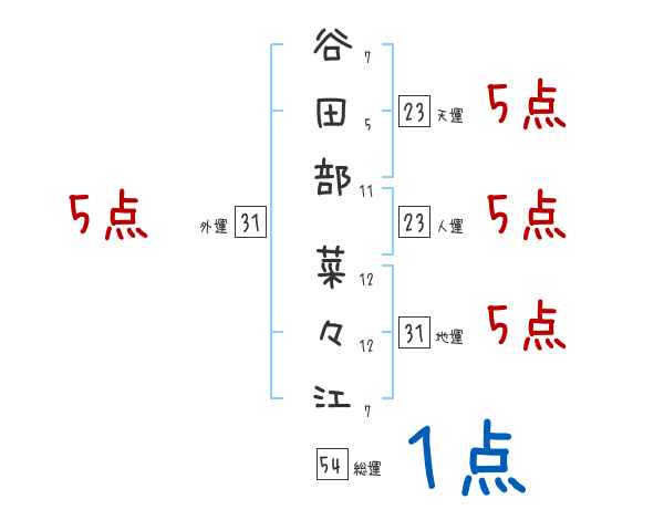 人運![]() | 谷田部菜々江さんの人運は23画の5つ星!想像力に優れ活力がある。一代で成功し名誉を手に入れる。 性格や才能などを表す2番目に重要な運勢です。人間関係や協調性、社会的な成功に影響します。主に20歳から50歳ぐらいまでの中年期の運勢を表します。 |
