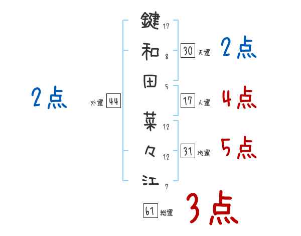 天運![]() | 鍵和田菜々江さんの天運は30画の2つ星!浮き沈みの激しさに注意しましょう。 家系が持つ宿命的な運勢を表します。祖先から受け継いだ苗字ですので自分の力が及びません。家柄を象徴します。 |