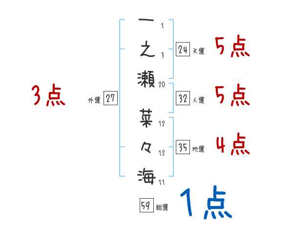 人運![]() | 一之瀬菜々海さんの人運は32画の5つ星!柔軟性があり成功する。チャンスが多く金運が良い。 性格や才能などを表す2番目に重要な運勢です。人間関係や協調性、社会的な成功に影響します。主に20歳から50歳ぐらいまでの中年期の運勢を表します。 |