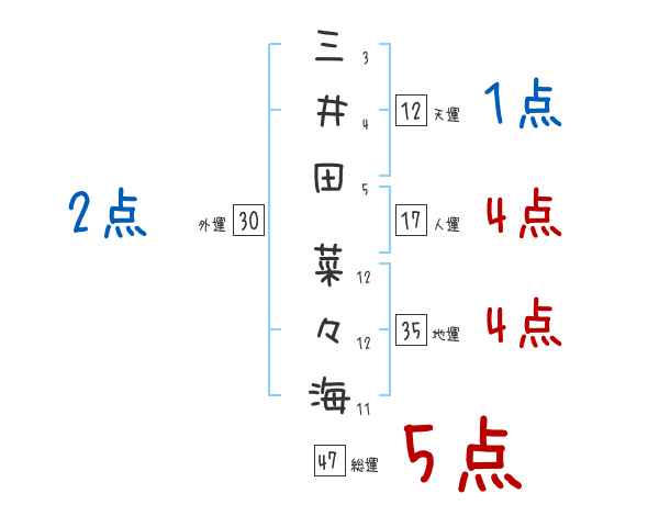 総運![]() | 三井田菜々海さんの総運は47画の5つ星!実力が開花し発展する円満な人生。財に恵まれる。 あなたの人生を表す1番重要な運勢です。生涯を通じて影響する総合運となり、主に50歳以降の晩年期に影響を及ぼします。 |
