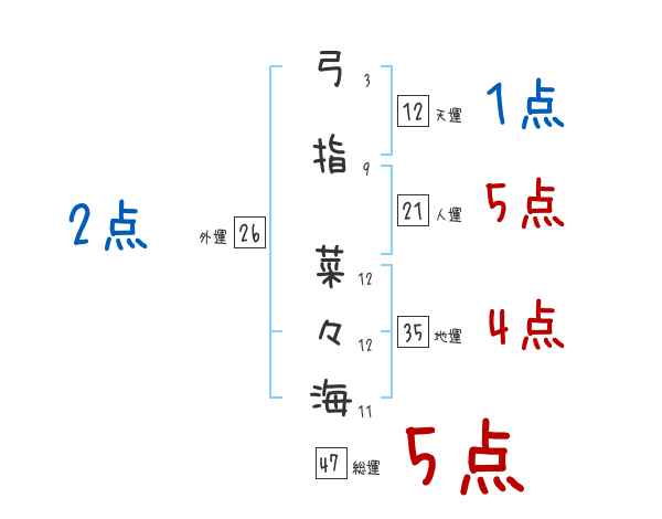 総運![]() | 弓指菜々海さんの総運は47画の5つ星!実力が開花し発展する円満な人生。財に恵まれる。 あなたの人生を表す1番重要な運勢です。生涯を通じて影響する総合運となり、主に50歳以降の晩年期に影響を及ぼします。 |