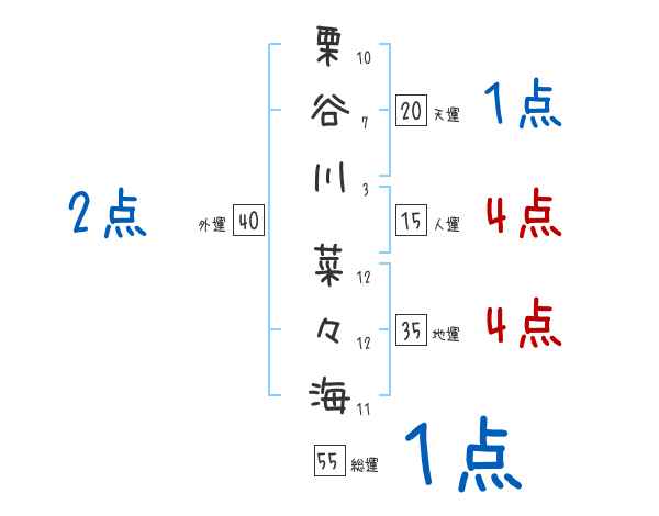 外運![]() | 栗谷川菜々海さんの外運は40画の2つ星!自信過剰で物事に固執するためトラブルに注意。 生活面を象徴する運勢です。外部から受ける影響力を表し、結婚運、家庭運や職場、環境への順応性を表します。 |