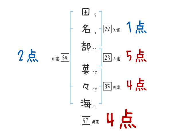 総運![]() | 田名部菜々海さんの総運は57画の4つ星!向上心があり人望がある。地位を得る。 あなたの人生を表す1番重要な運勢です。生涯を通じて影響する総合運となり、主に50歳以降の晩年期に影響を及ぼします。 |