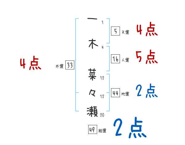 総運![]() | 一木菜々瀬さんの総運は49画の2つ星!不安定な性格で明暗がある人生。周りの人には支援されやすい。 あなたの人生を表す1番重要な運勢です。生涯を通じて影響する総合運となり、主に50歳以降の晩年期に影響を及ぼします。 |