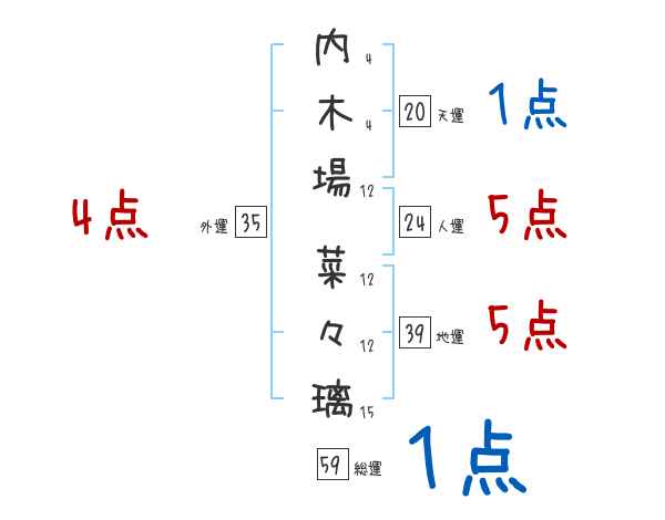 外運![]() | 内木場菜々璃さんの外運は35画の4つ星!温厚な性格で感受性が高い。穏和な性格で人望が厚い。 生活面を象徴する運勢です。外部から受ける影響力を表し、結婚運、家庭運や職場、環境への順応性を表します。 |