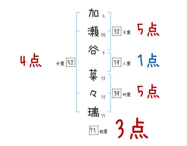 外運![]() | 加瀬谷菜々璃さんの外運は52画の4つ星!先見性と独創性に優れ考える力がある。強運の持ち主。 生活面を象徴する運勢です。外部から受ける影響力を表し、結婚運、家庭運や職場、環境への順応性を表します。 |