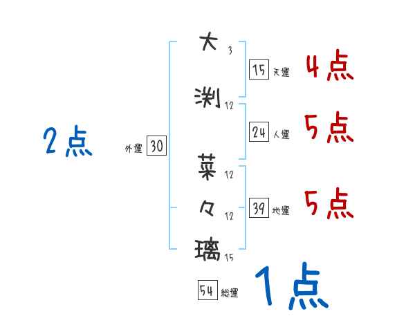 総運![]() | 大渕菜々璃さんの総運は54画の1つ星!トラブルが多いかも。周りをよく見て協調して過ごしましょう。 あなたの人生を表す1番重要な運勢です。生涯を通じて影響する総合運となり、主に50歳以降の晩年期に影響を及ぼします。 |
