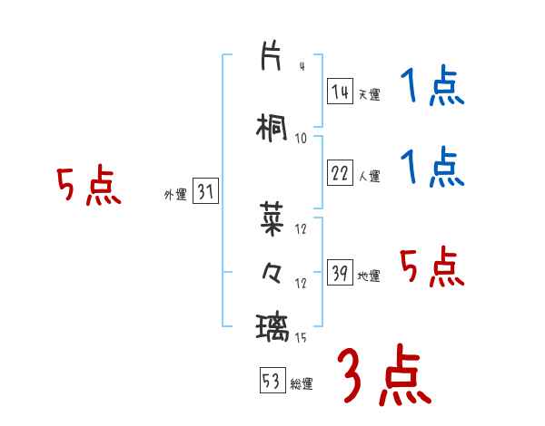 総運![]() | 片桐菜々璃さんの総運は53画の3つ星!やや見栄っ張りで虚栄心がある。散財に注意。 あなたの人生を表す1番重要な運勢です。生涯を通じて影響する総合運となり、主に50歳以降の晩年期に影響を及ぼします。 |
