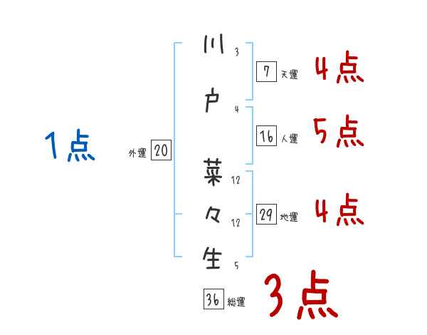 総運![]() | 川戸菜々生さんの総運は36画の3つ星!先見性が豊かです。多少神経質で苦労することも。 あなたの人生を表す1番重要な運勢です。生涯を通じて影響する総合運となり、主に50歳以降の晩年期に影響を及ぼします。 |