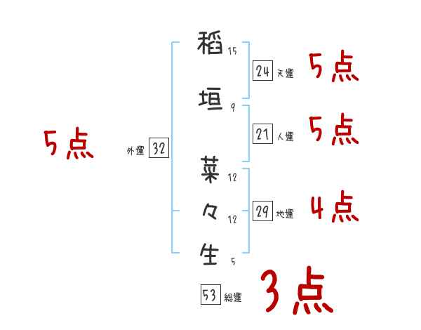 外運![]() | 稻垣菜々生さんの外運は32画の5つ星!柔軟性があり成功する。チャンスが多く金運が良い。 生活面を象徴する運勢です。外部から受ける影響力を表し、結婚運、家庭運や職場、環境への順応性を表します。 |