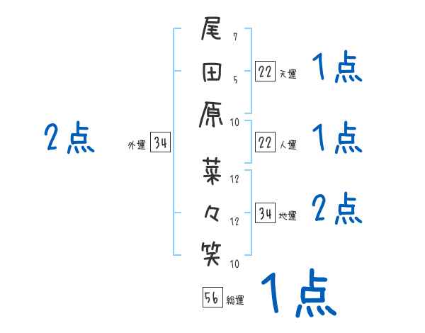 人運![]() | 尾田原菜々笑さんの人運は22画の1つ星!努力することが苦手ないっぽう手先が器用。芸術性にも優れる。 性格や才能などを表す2番目に重要な運勢です。人間関係や協調性、社会的な成功に影響します。主に20歳から50歳ぐらいまでの中年期の運勢を表します。 |