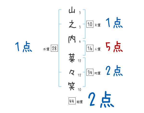 天運![]() | 山之内菜々笑さんの天運は10画の1つ星!不安を感じやすい傾向。ストレスを抱えないように注意しましょう。 家系が持つ宿命的な運勢を表します。祖先から受け継いだ苗字ですので自分の力が及びません。家柄を象徴します。 |