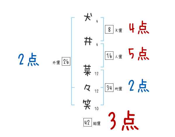 総運![]() | 犬井菜々笑さんの総運は42画の3つ星!病気に注意。多芸であるが消極的でおとなしい。 あなたの人生を表す1番重要な運勢です。生涯を通じて影響する総合運となり、主に50歳以降の晩年期に影響を及ぼします。 |