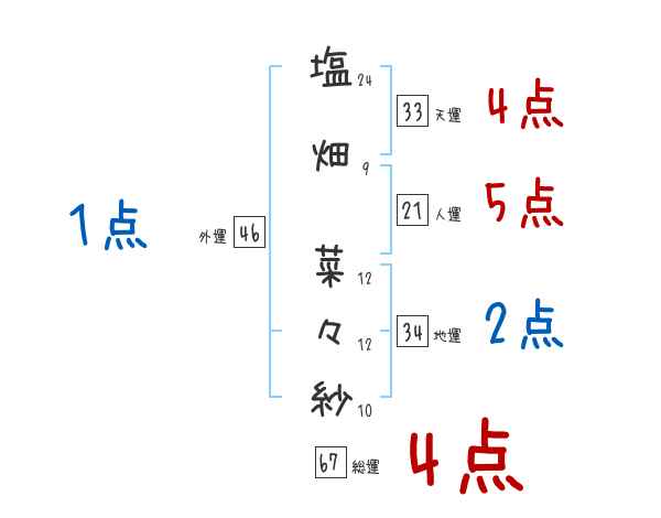 天運![]() | 塩畑菜々紗さんの天運は33画の4つ星!権力志向でプライドが高い。勇気があり運を切り開き成功する。 家系が持つ宿命的な運勢を表します。祖先から受け継いだ苗字ですので自分の力が及びません。家柄を象徴します。 |