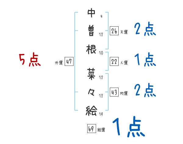 外運![]() | 中曽根菜々絵さんの外運は47画の5つ星!実力が開花し発展する円満な人生。財に恵まれる。 生活面を象徴する運勢です。外部から受ける影響力を表し、結婚運、家庭運や職場、環境への順応性を表します。 |