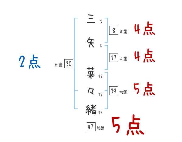 総運![]() | 三矢菜々緒さんの総運は47画の5つ星!実力が開花し発展する円満な人生。財に恵まれる。 あなたの人生を表す1番重要な運勢です。生涯を通じて影響する総合運となり、主に50歳以降の晩年期に影響を及ぼします。 |