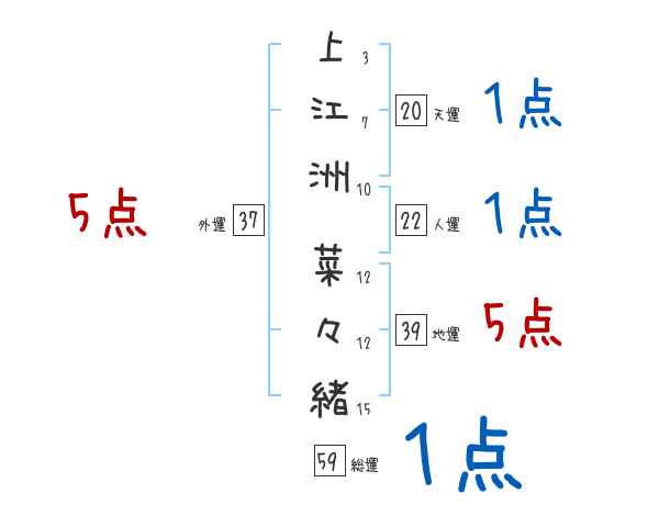 総運![]() | 上江洲菜々緒さんの総運は59画の1つ星!意志の弱さであきらめることが多いかも。粘り強さが必要。 あなたの人生を表す1番重要な運勢です。生涯を通じて影響する総合運となり、主に50歳以降の晩年期に影響を及ぼします。 |