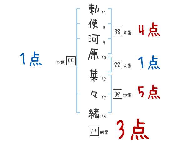 天運![]() | 勅使河原菜々緒さんの天運は38画の4つ星!温厚な性格で技術的な才能を発揮する。職人的な仕事に向いている。 家系が持つ宿命的な運勢を表します。祖先から受け継いだ苗字ですので自分の力が及びません。家柄を象徴します。 |