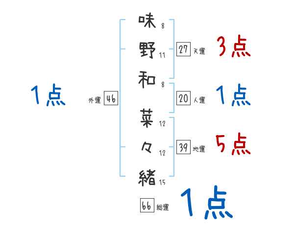 天運![]() | 味野和菜々緒さんの天運は27画の3つ星!頭脳明晰だが強情で摩擦が多い傾向。孤立に注意。 家系が持つ宿命的な運勢を表します。祖先から受け継いだ苗字ですので自分の力が及びません。家柄を象徴します。 |