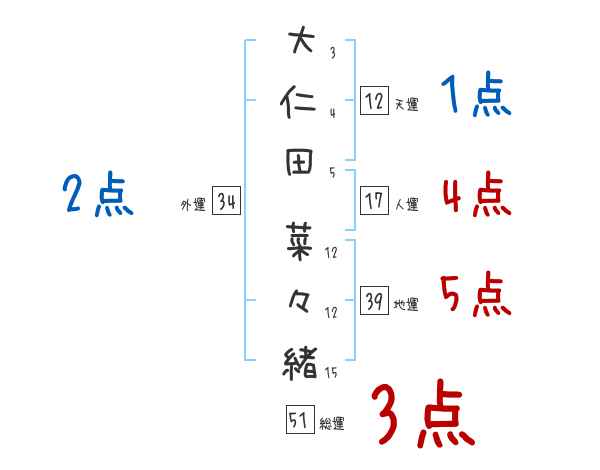 総運![]() | 大仁田菜々緒さんの総運は51画の3つ星!変化が激しく、危険に注意。堅実な性格。 あなたの人生を表す1番重要な運勢です。生涯を通じて影響する総合運となり、主に50歳以降の晩年期に影響を及ぼします。 |