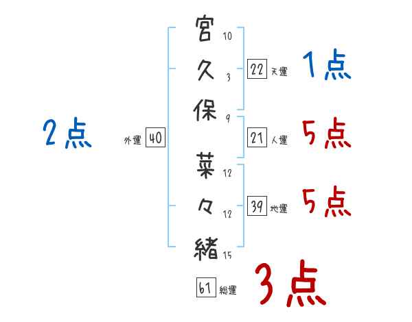 天運![]() | 宮久保菜々緒さんの天運は22画の1つ星!努力することが苦手ないっぽう手先が器用。芸術性にも優れる。 家系が持つ宿命的な運勢を表します。祖先から受け継いだ苗字ですので自分の力が及びません。家柄を象徴します。 |